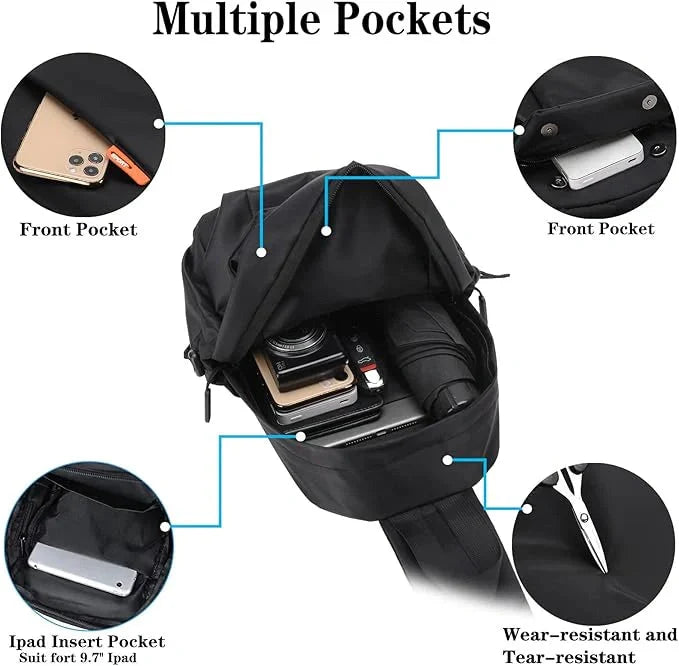 1 main compartment, has a zip closure, 3 external pockets, 2 inner pockets